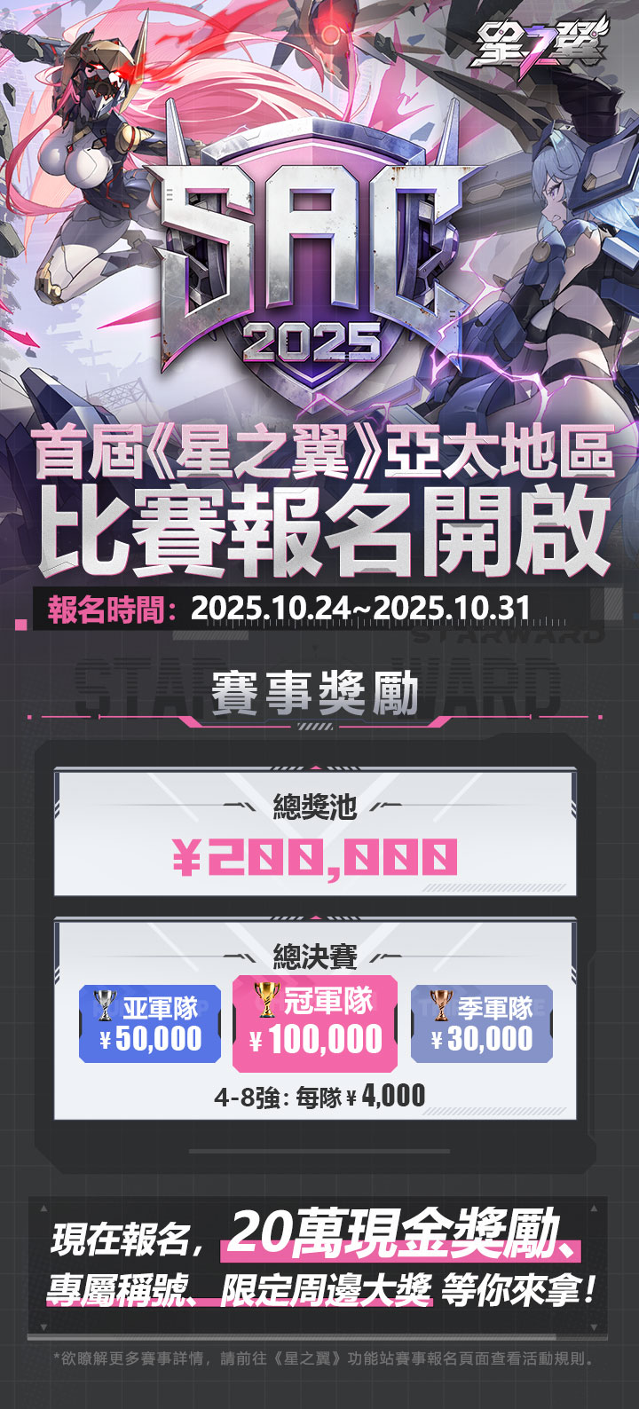 由《星之翼》官方舉辦的首屆星之翼亞太地區比賽-STARWARD: ASTRA CHAMPIONSHIP(SAC 2025) 報名正式啟動!